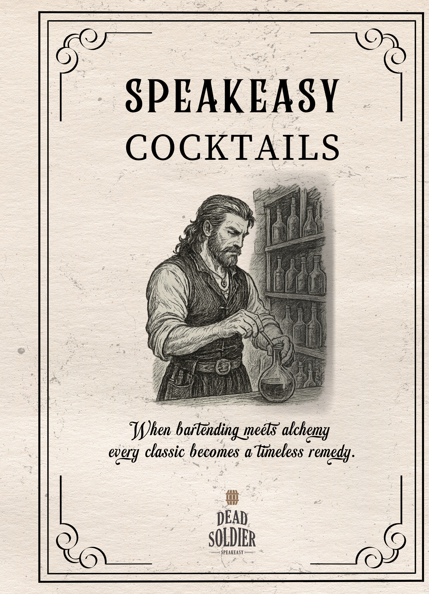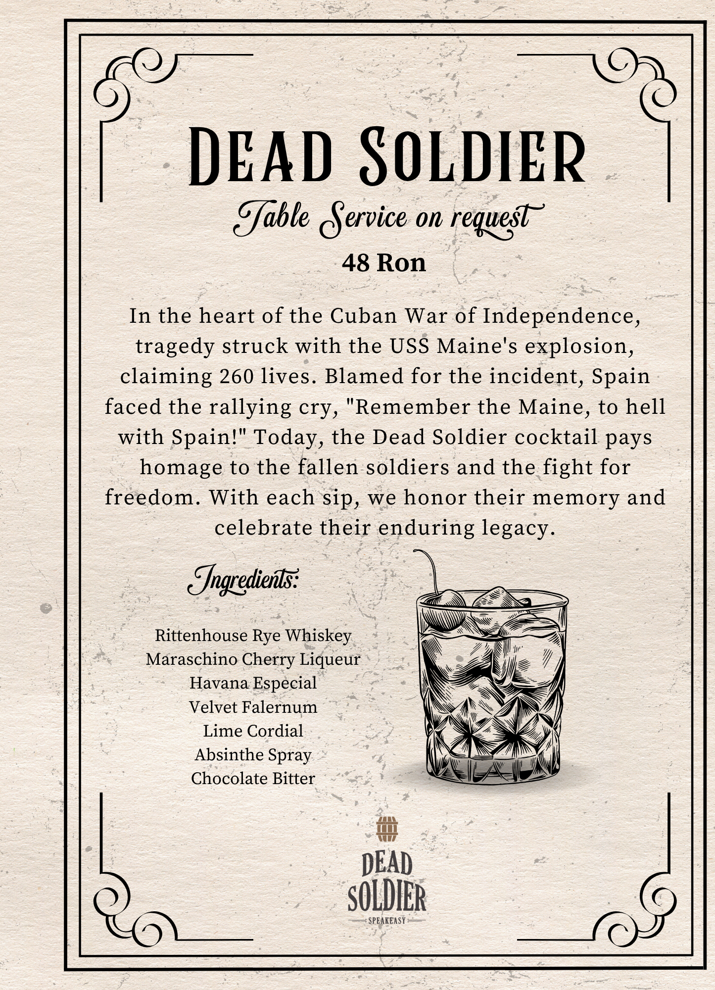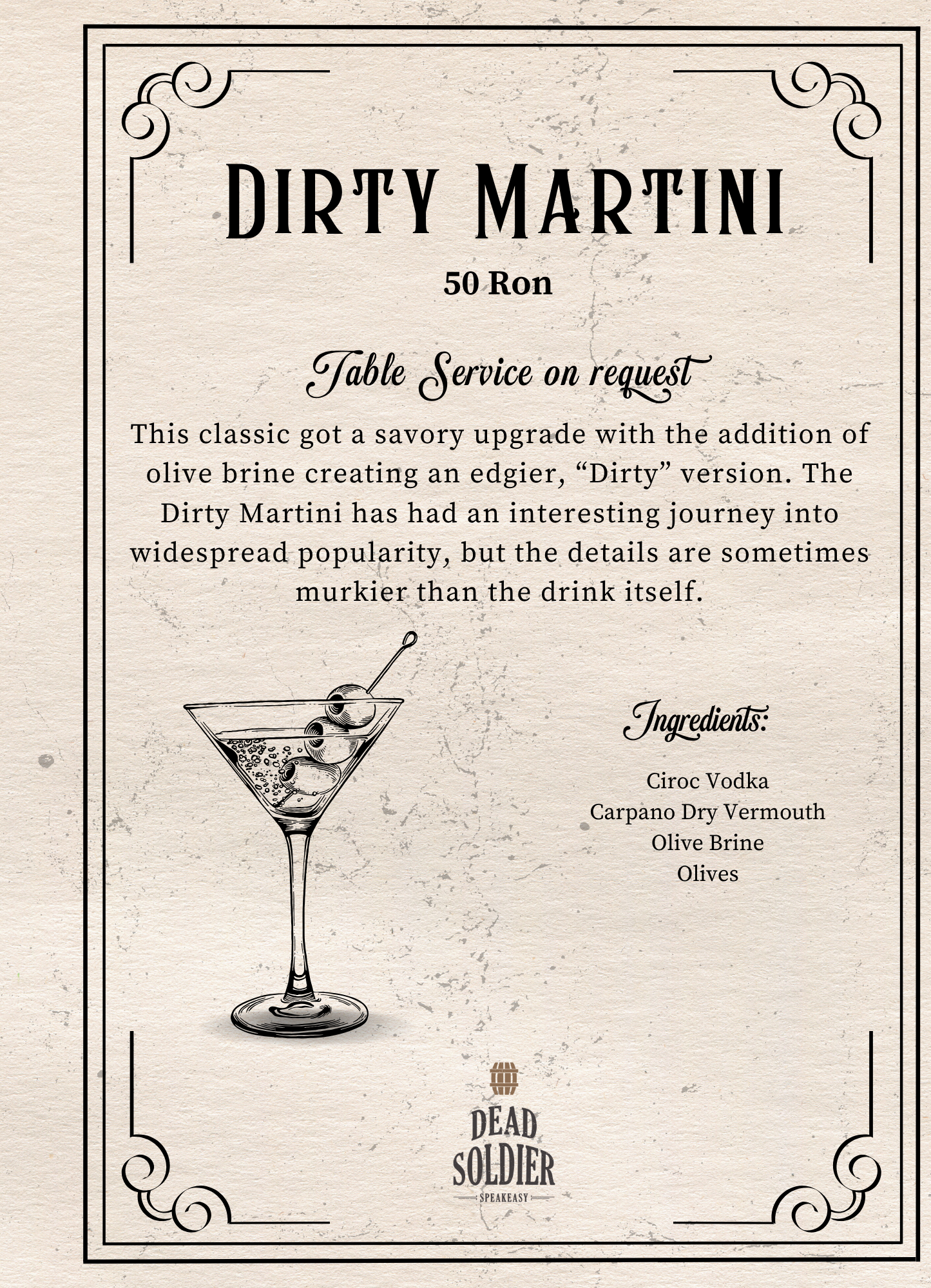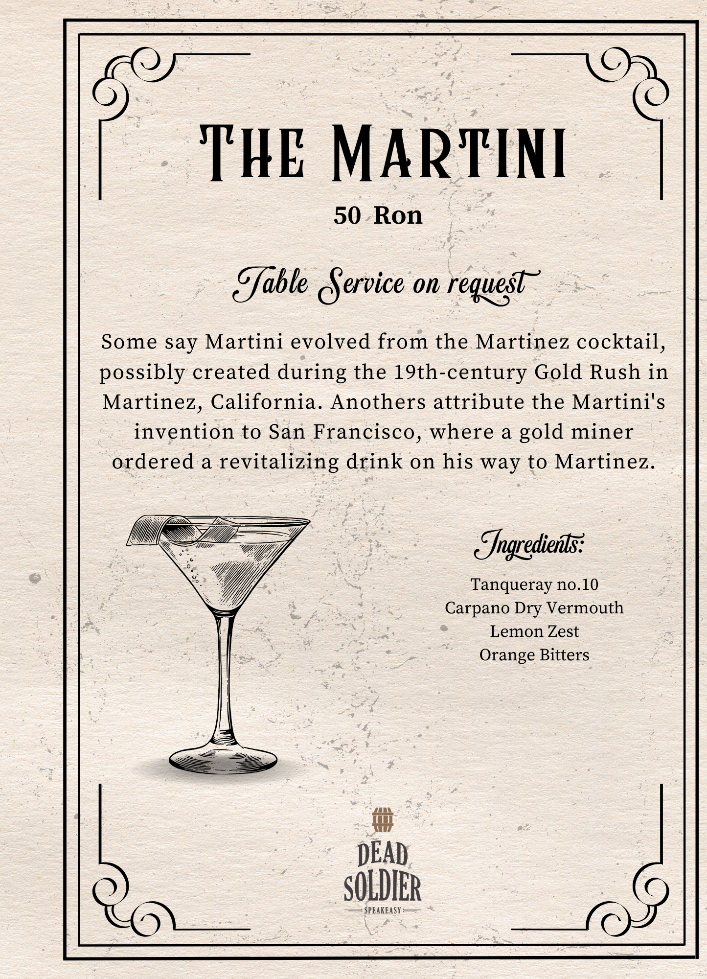 SOLDIER'S MENU The menu will be changed periodically, so you can have the chance to taste EVERY Classic Cocktail. Also, at Dead Soldier Bar, you will have the option to wrap up your favourite drink in an elegant bottle. Martini Cocktail can be made either at the bar or right at your table by the bartender. We work only with premium spirits and experienced bartenders. Cocktails Menu Liquid Courage List Bar Bites & Special Drinks