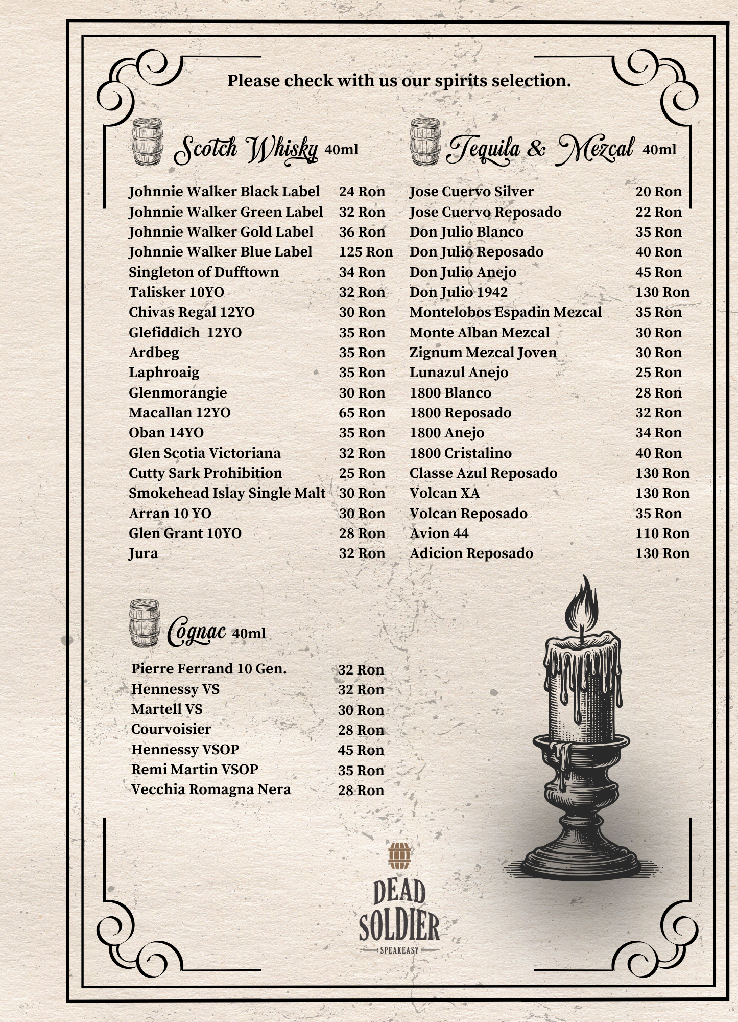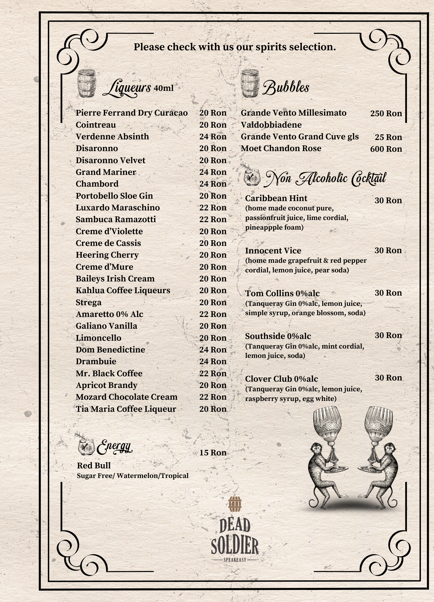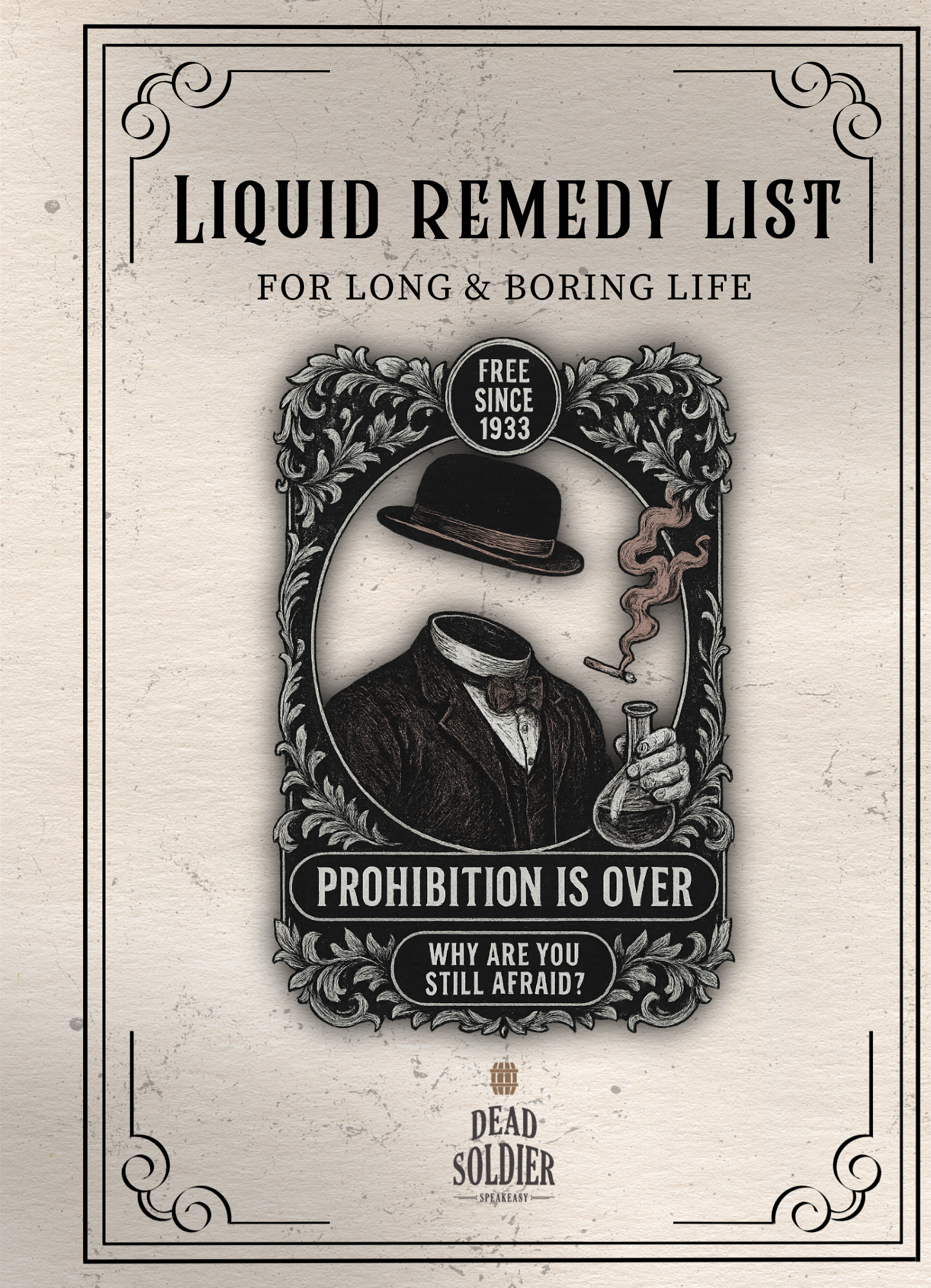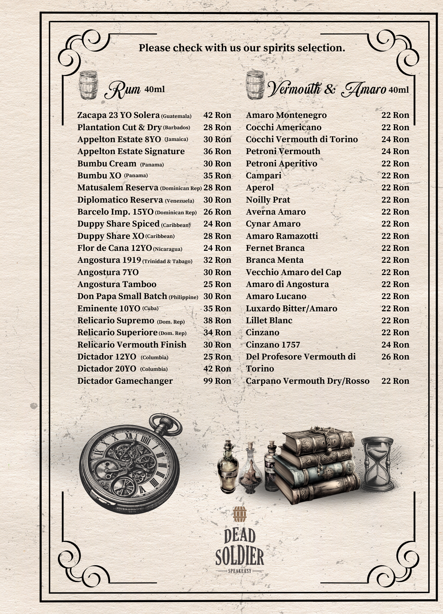 SOLDIER'S MENU The menu will be changed periodically, so you can have the chance to taste EVERY Classic Cocktail. Also, at Dead Soldier Bar, you will have the option to wrap up your favourite drink in an elegant bottle. Martini Cocktail can be made either at the bar or right at your table by the bartender. We work only with premium spirits and experienced bartenders. Cocktails Menu Liquid Courage List Bar Bites & Special Drinks