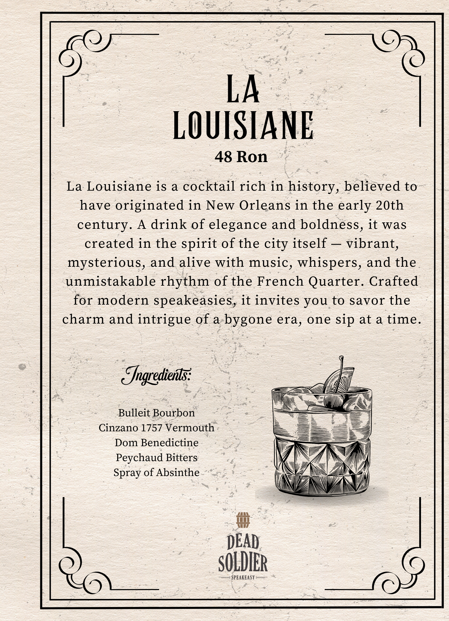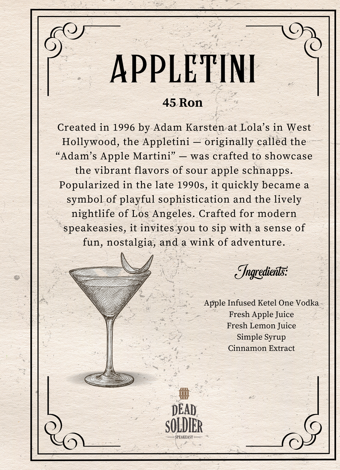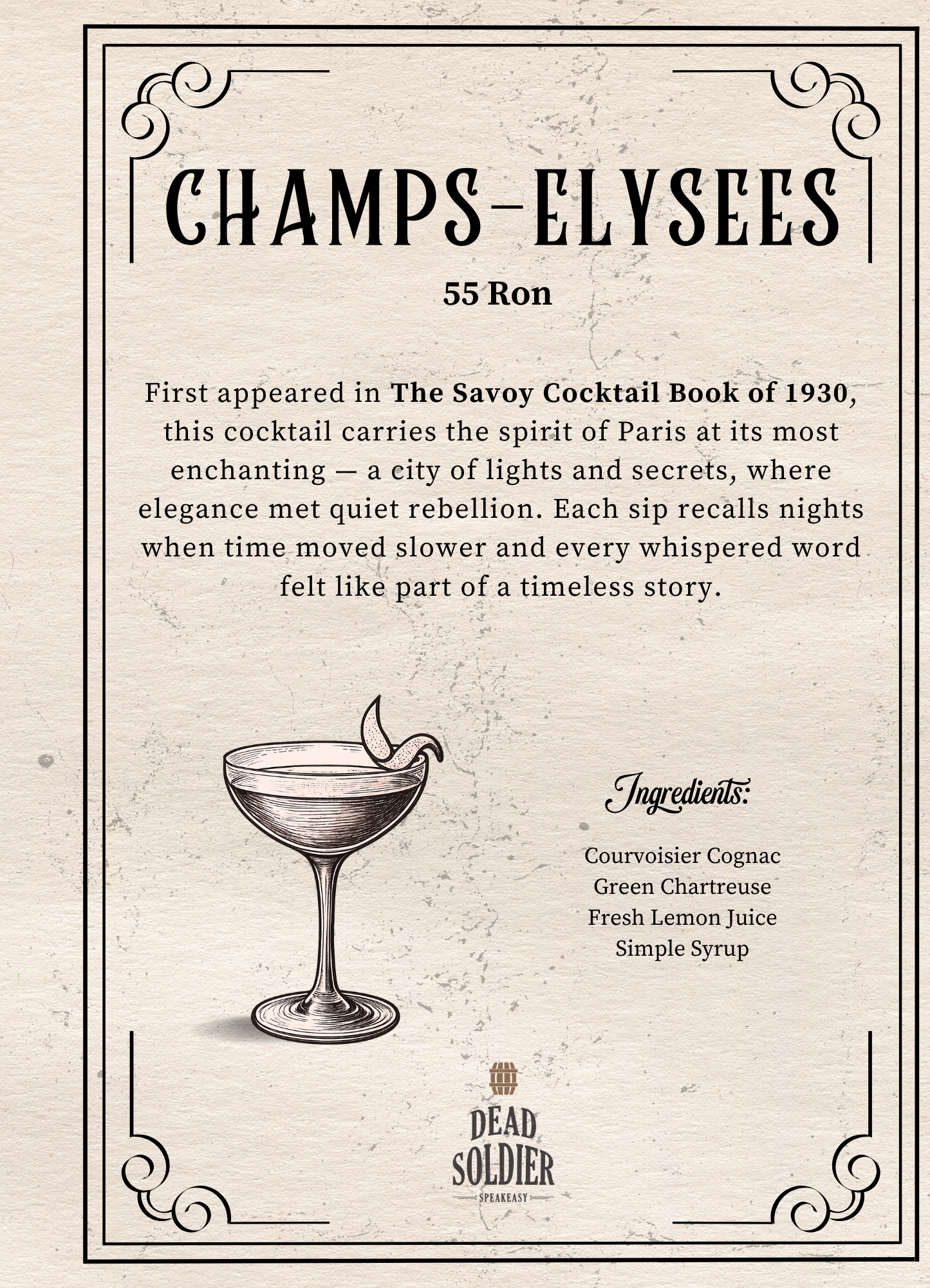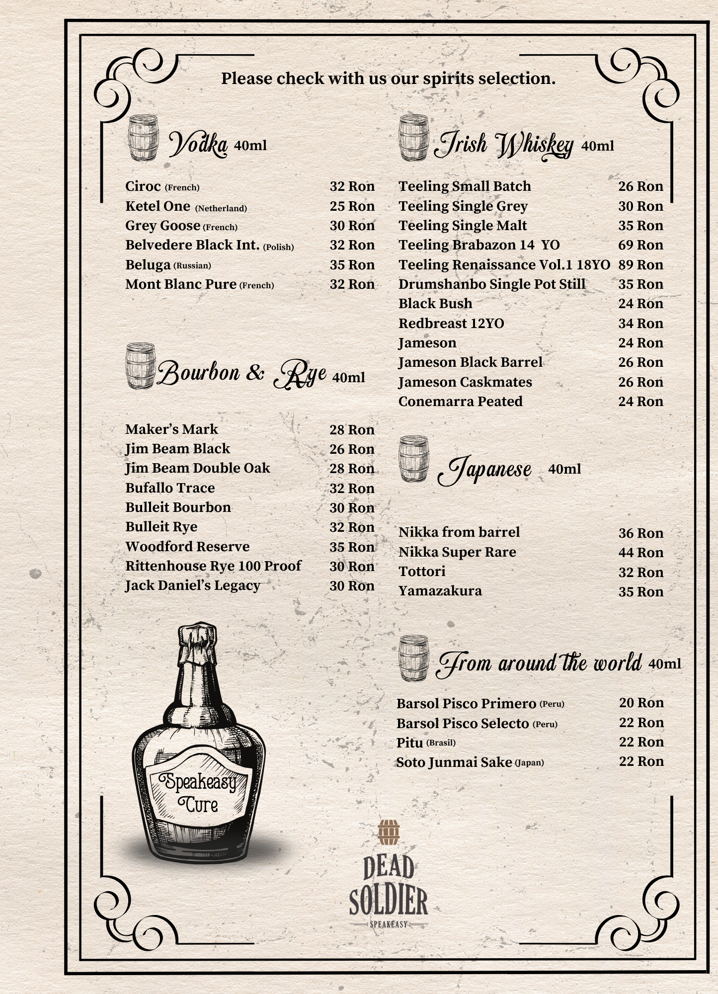 SOLDIER'S MENU The menu will be changed periodically, so you can have the chance to taste EVERY Classic Cocktail. Also, at Dead Soldier Bar, you will have the option to wrap up your favourite drink in an elegant bottle. Martini Cocktail can be made either at the bar or right at your table by the bartender. We work only with premium spirits and experienced bartenders. Cocktails Menu Liquid Courage List Bar Bites & Special Drinks
