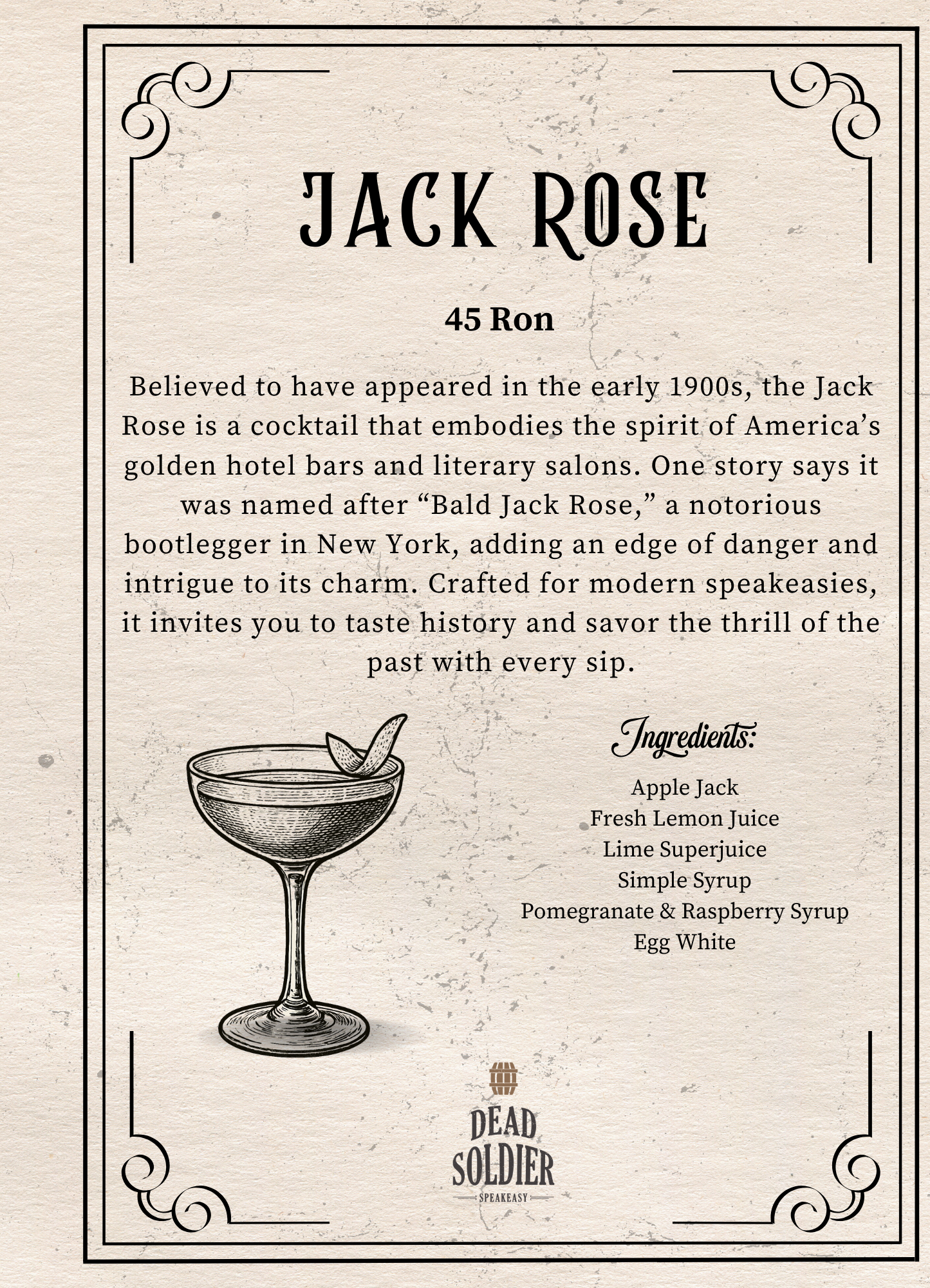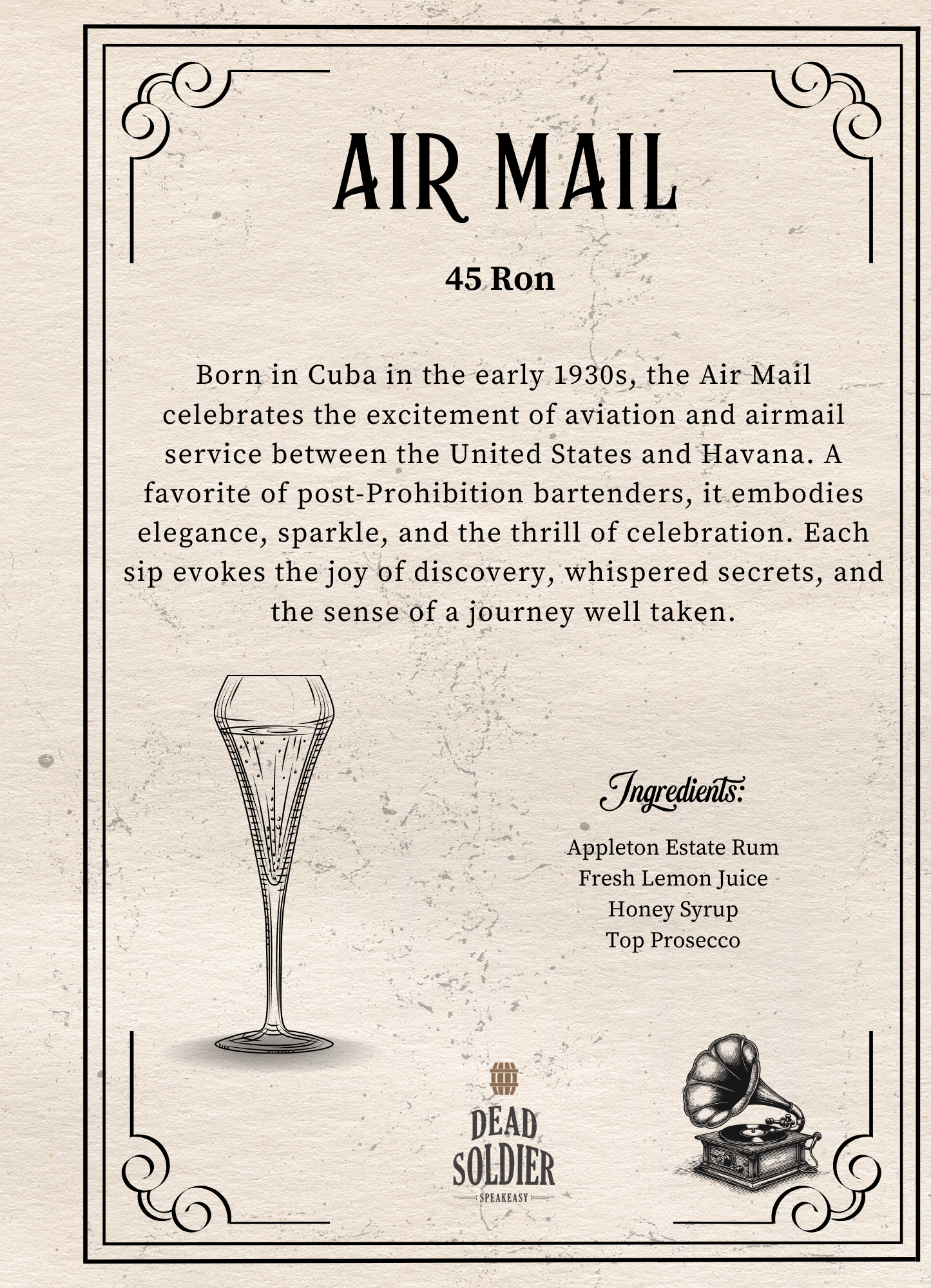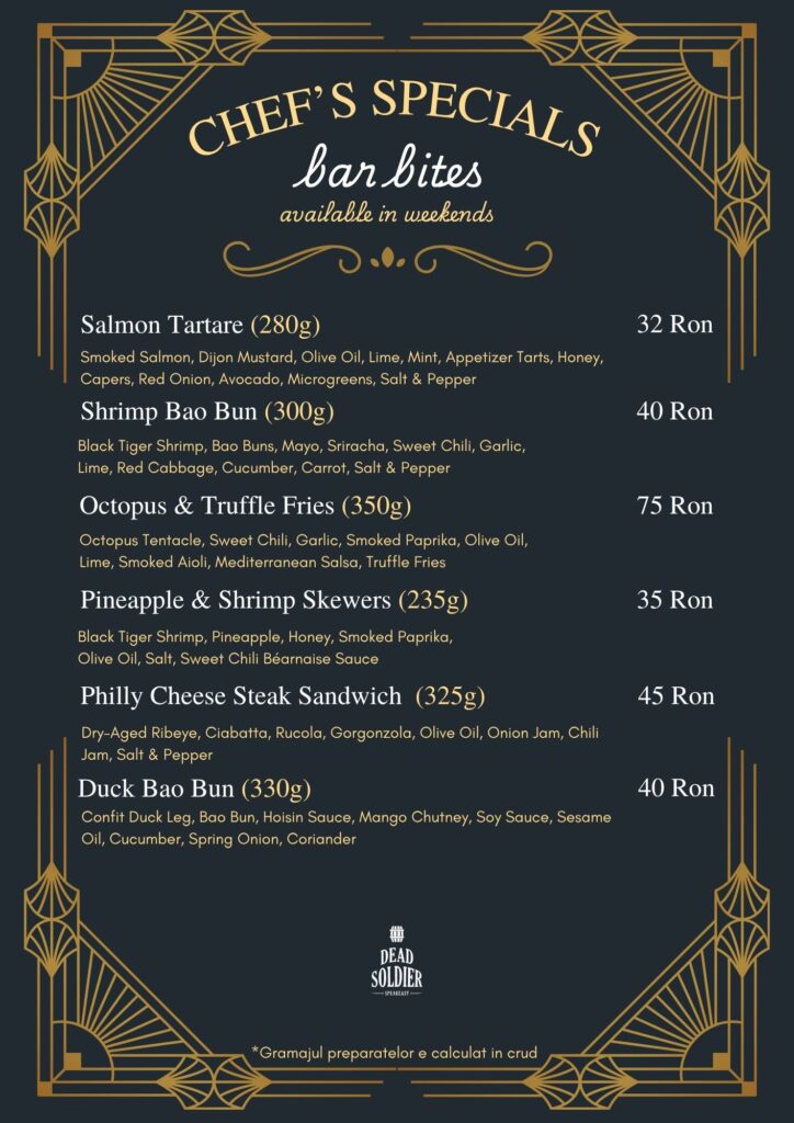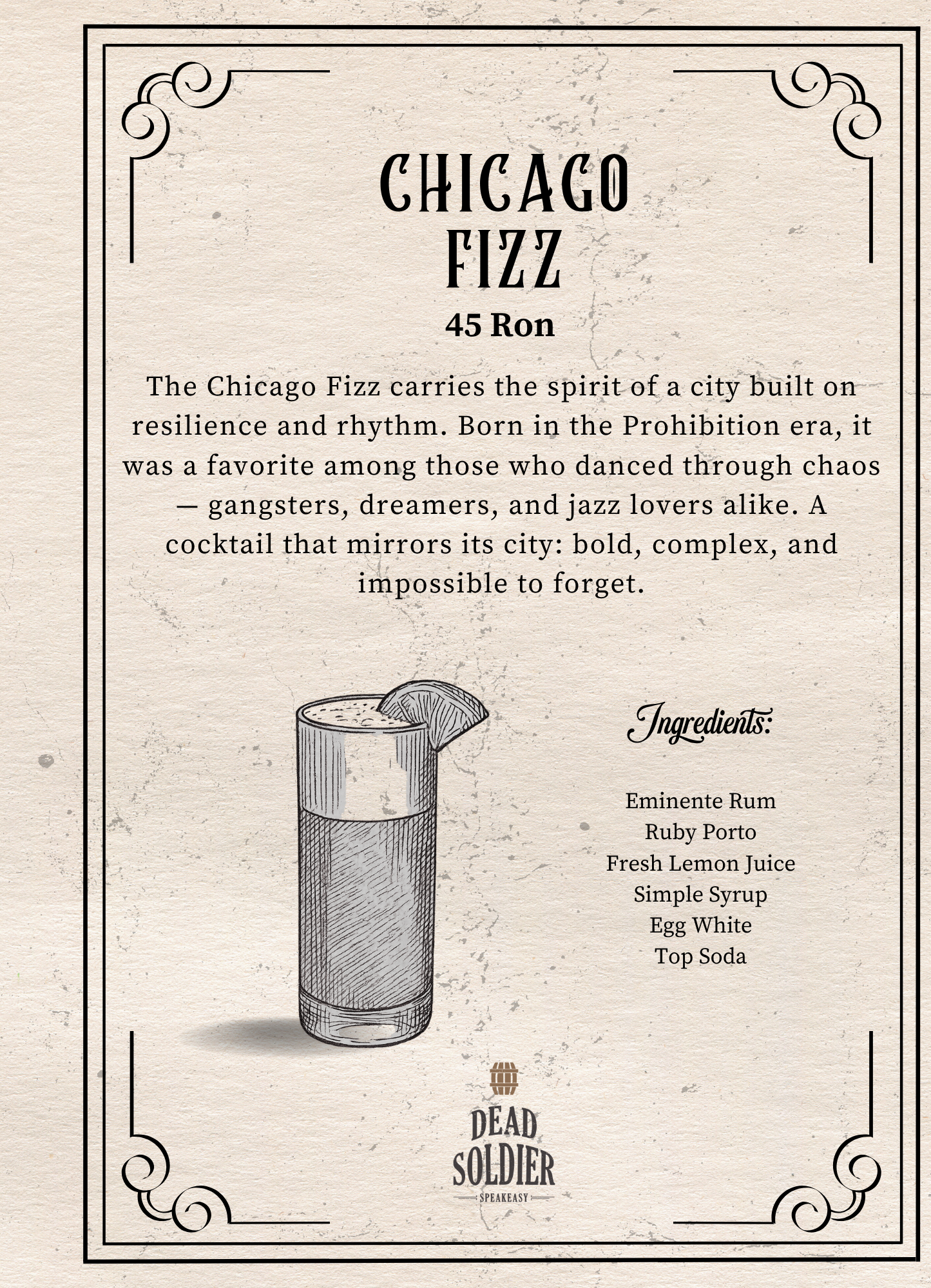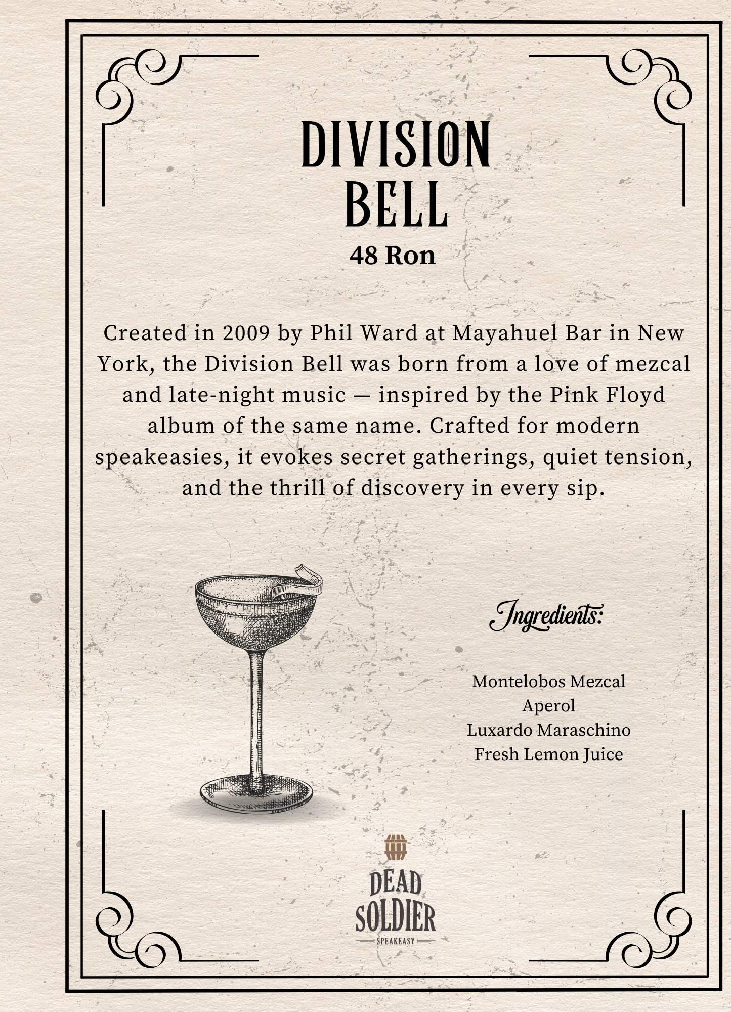 SOLDIER'S MENU The menu will be changed periodically, so you can have the chance to taste EVERY Classic Cocktail. Also, at Dead Soldier Bar, you will have the option to wrap up your favourite drink in an elegant bottle. Martini Cocktail can be made either at the bar or right at your table by the bartender. We work only with premium spirits and experienced bartenders. Cocktails Menu Liquid Courage List Bar Bites & Special Drinks